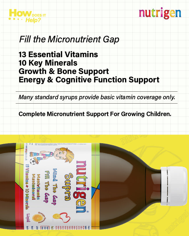 Bridge the hidden nutritional gap with Nutrigen Supra Multivitamin & Mineral Syrup, it's a comprehensive liquid formula providing 13 essential vitamins and 10 key minerals to support children’s growth, immunity, and mental performance. Designed as daily “nutritional insurance,” Supra helps protect against micronutrient deficiencies caused by modern diets high in processed foods and low in essential nutrients.